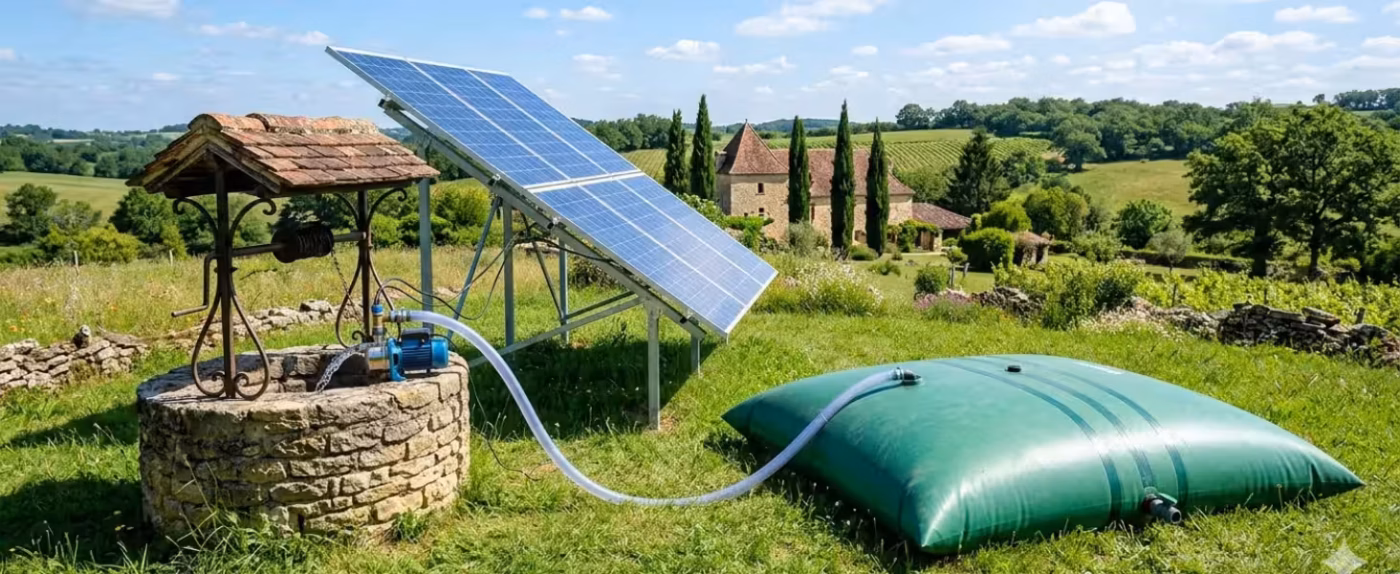Pas de fonctionnement nocturne (sauf avec batterie). Si vous avez besoin d’eau la nuit ou tôt le matin, il faut prévoir un stockage tampon — typiquement une citerne — ou ajouter un système de batteries, ce qui augmente le coût.
